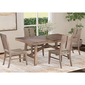 Drawing inspiration from exposed beam architecture, the Casual Loft Dining collection updates the traditional farmhouse style. Constructed with solid hickory with a light Roasted Hazelnut finish, the beauty of the wood becomes the focal point of the room. Strong vertical elements are found from the angular base of the table and the vertical hardware on the server front.Read More