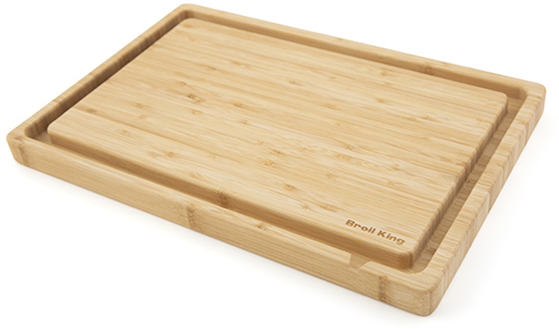 The Baron™ series double-sided bamboo cutting board is the essential tool for cooked meat carving or pre grilling prep. The board is designed to fit perfectly on the side shelf of any Baron™ gas grill to do your prep or carving work grill side. On one side of the board, the large capacity moat traps drippings and has an easy pour spout to pour them off. The flat side is a full chopping surface. Hand was the durable bamboo surfaces, avoid the dishwasher.
