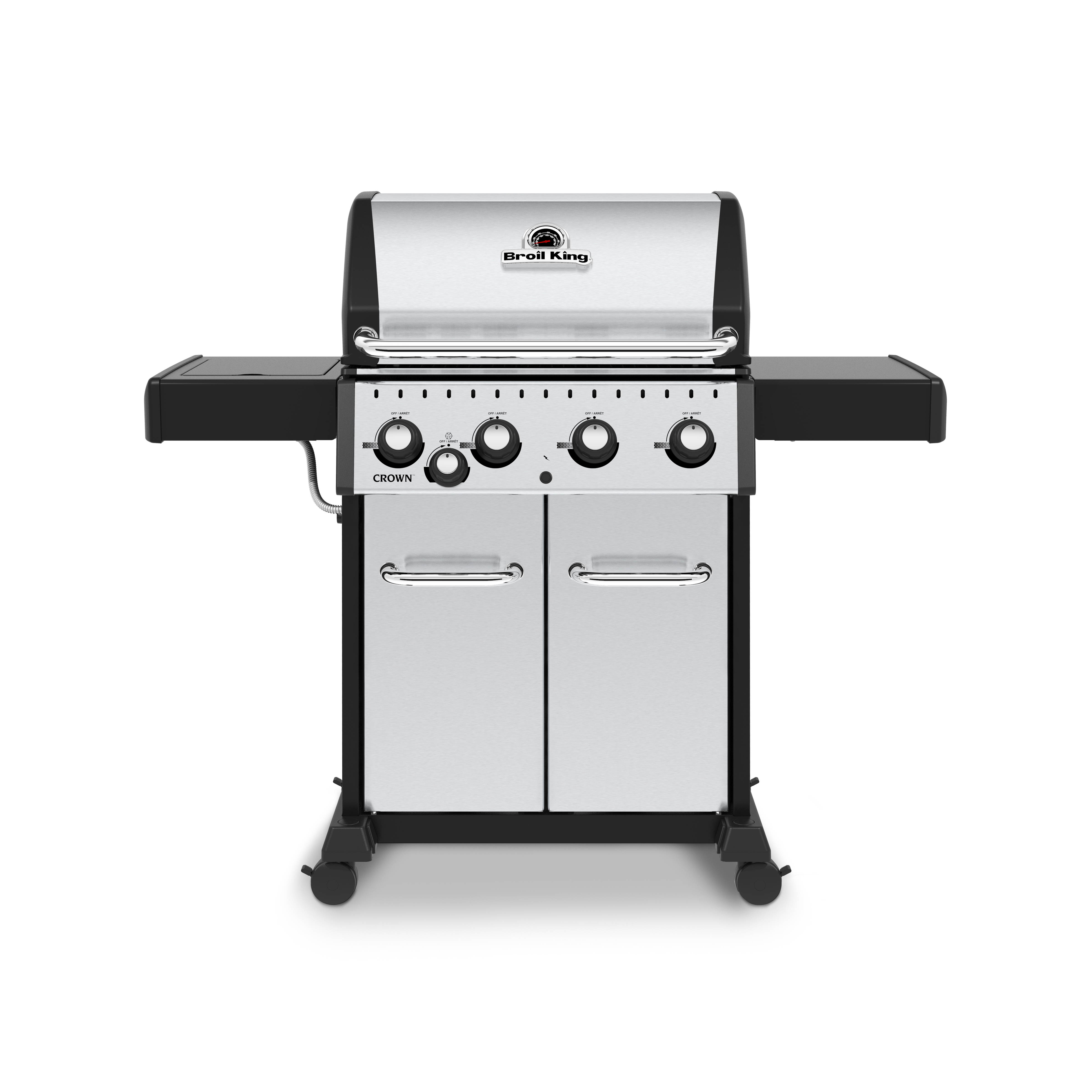 The Broil King® Crown™ 400 Series features 460 sq. in. primary cooking surface and includes a durable cast aluminum oven, stainless steel side burner, 4 stainless steel Dual-Tube™ burners, stainless steel Flav-R-Wave™ cooking system, and electronic ignition. All Crown 400 series include heavy-duty 3-position cast iron cooking grids, black drop-down side shelves and enclosed black cabinet base.Read More