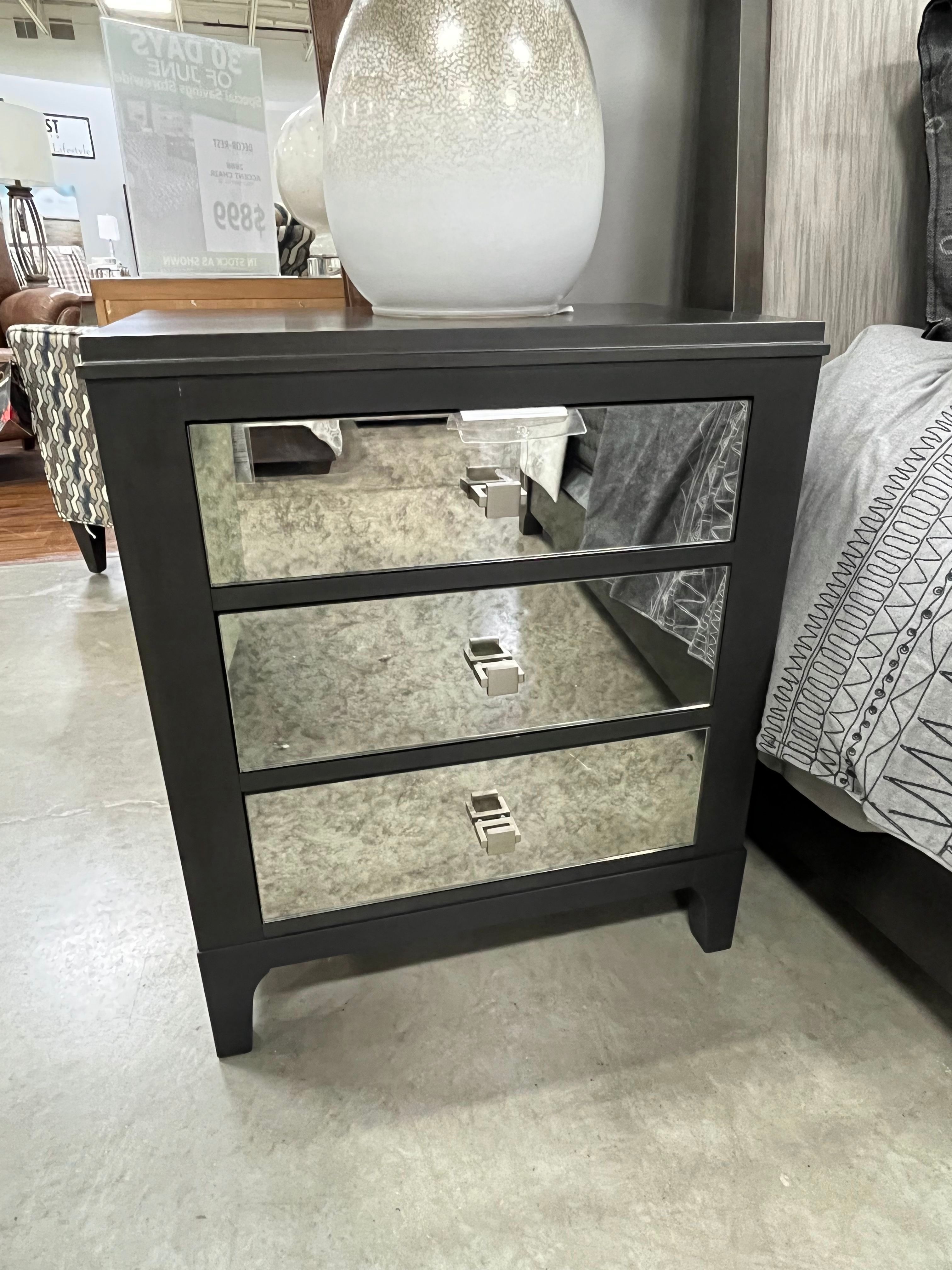 This nightstand is made in a contemporary style and features solid Maple wood in a Smoke finish with three mirrored drawers.