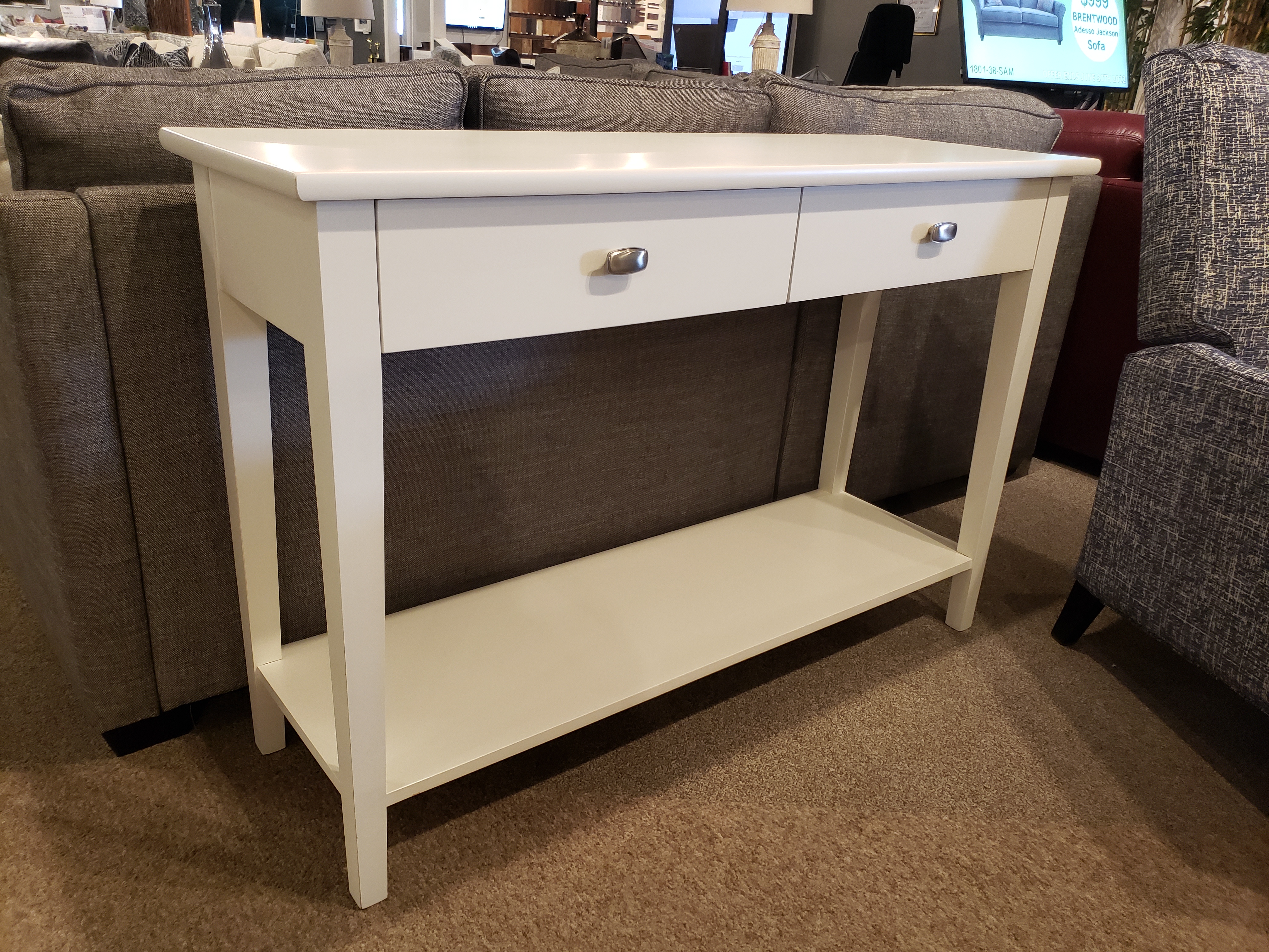 Our showroom displays the table in PLWH finish with K drawer option