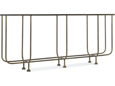 Appearing to float in air, the lightly-scaled metal-frame of the Kiara Sofa Console is elevated on metal feet. Crafted of iron in a bronze metal finish, it must be used with the coordinating tempered glass top.Read More
