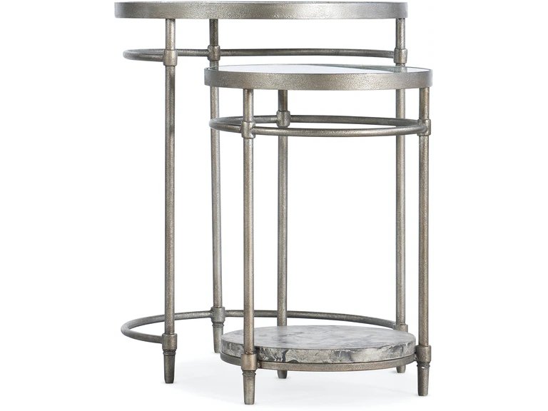 Opulent, yet approachable, timeless, yet modern, these striking nesting tables are crafted of concrete, metal and glass with a champagne-coloured metal frame and concrete in a gray and black pattern. Both tables have glass tops, and the smaller table has a concrete bottom shelf and slides beneath the larger table. Give your home a shot of style with our living room furniture. Make this room the perfect spot for conversation, entertaining or just relaxing.Read More