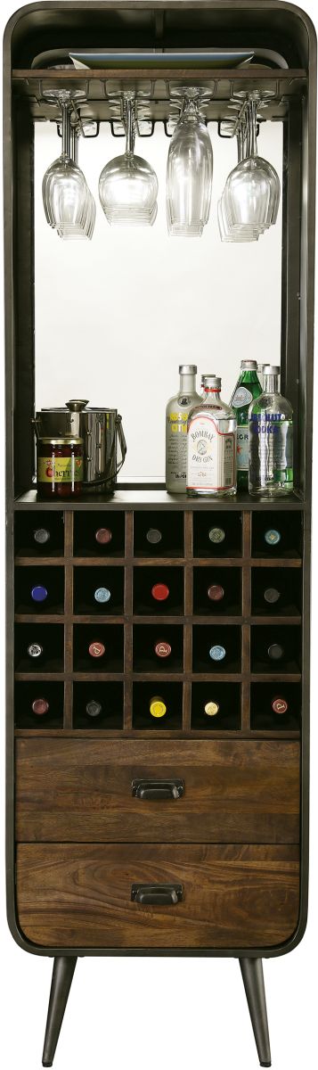 Never worry about wine and barware storage again. A metal stemware rack holds up to 12 large wine glasses and a wooden wine bottle rack in the lower cabinet holds up to 20 bottles. Two wooden drawers with smooth running metal slides and metal cup pulls complete the storage, finished in aged iron.