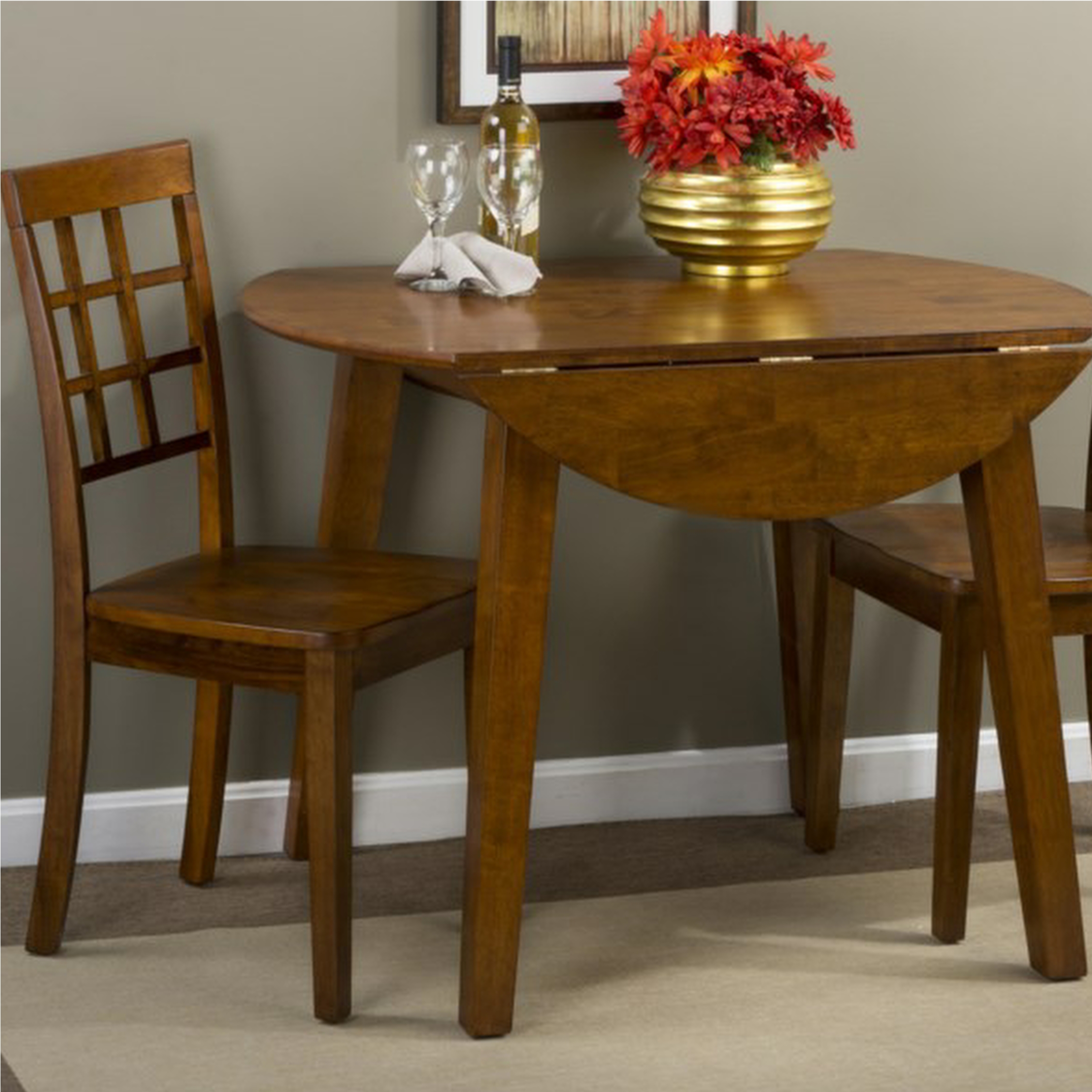 Adding a simple charm to dining room arrangements, this two-four person table set will highlight your home with a look that is relaxed but not under-appreciated. The pieces are made of solid rubberwood finished in a rich and beautiful tone that allows elements of the natural wood grain to show. The legs on the table feature a slight outward slant which not only complements the table but also creates a little extra leg room. The table top also has a drop-leaf construction allowing it to shrink down a bit when you need a little extra space.Read More