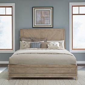 Transform your bedroom into a haven of sophistication with the Brentwood queen panel bed. Crafted with meticulous attention to detail using Rubberwood solids and Split Heart White Oak veneers, this bed features a Sandstone finish. The focal point of the bed lies in its picture frame molding with soft shaping, providing a touch of graceful curves that adds a subtle sense of refinement to any bedroom décor. The panel of the headboard is adorned with an overlay featuring a captivating sunburst veneer pattern, reminiscent of a radiant sunrise that brings warmth and tranquility to your sleeping space. To accentuate the beauty of the panel, it is adorned with bead molding that frames the edges, creating a harmonious balance of texture and form. The meticulous craftsmanship is evident in every inch of this bed, making it a true statement piece that elevates the ambiance of your bedroom. Accentuating this artful design is a center overlay panel on the footboard, adding a layer of dimension and refinement to the overall composition. What sets this footboard apart is its floating base, a design element that imparts a sense of lightness and modernity. The base flows seamlessly into a saber foot, adding a touch of classic flair to the contemporary aesthetic. This integration of traditional and modern elements creates a piece that is both timeless and on-trend. Constructed with precision and attention to detail, the Brentwood queen panel bed is more than a functional component of your bedroom. It’s a work of art that transforms your sleeping space into a sanctuary of style and sophistication. Embrace the perfect blend of form and function with the Brentwood queen panel bed, that speaks volumes about your discerning tase and appreciation for the finer things in life.Read More