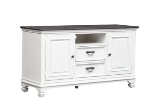 Indulge in a classic look and casual feel with the Allyson Park 56" TV console. Crafted with pine solids and veneers with cathedral white oak veneer top, this piece can accommodate most 62" TVs and features a wire brushed white finish with charcoal planked tops, full extensions drawer glides for easy access to storage, antiqued pewter knob hardware, fully stained interior drawers, square tapered feet and 1 adjustable shelf behind each door. The open compartment and wire management provisions effortlessly accommodate electronics or gaming equipment.Read More
