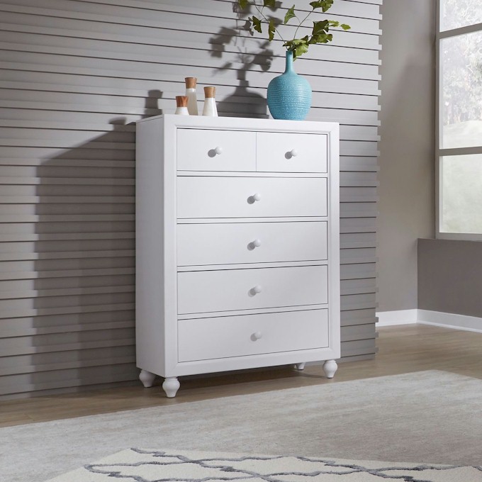 Indulge in cottage design with the Cottage View 5 drawer chest. Crafted by melamine and a rubberwood solid frame, this piece features a clean white finish, kenlin drawer glides, bottom case dust proofing, a laminate drawer interior, bluff cut top drawers, solid wood picture framed molding, bun feet, and is acented by wood knob hardware.Read More