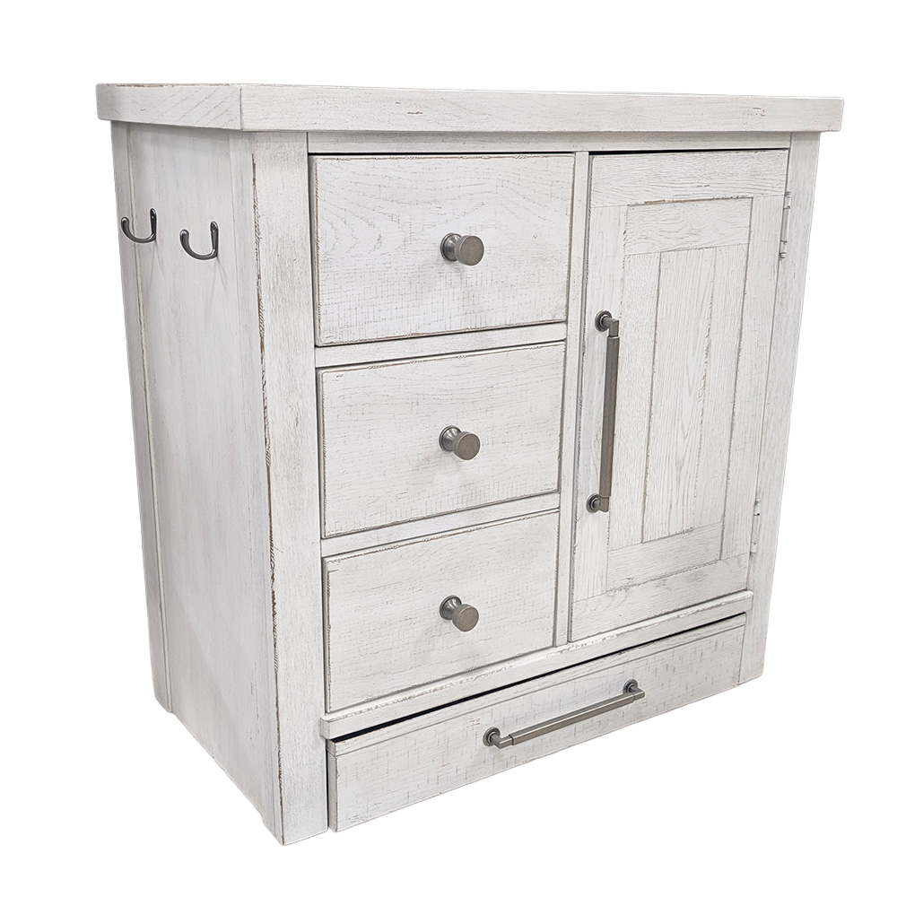 Serve your pet in style with the Modern Farmhouse pet feeder. Crafted with Poplar solids and Knotty White Oak veneers, this piece features a Dusty Charcoal finish with heavy distressing. There are three storage drawers and a bottom pull out drawer that reveals two pet feeder bowls encased with a black laminated surface for easy clean up. There is one door that has a high-low veneer geometrical pattern. The door opens to reveal one adjustable shelf, and is the perfect place to store food and treats. Two hooks are located on each side of the pet feeder, great for hanging leashes and harnesses. Washed Brass knob and elongated bar pull hardware complete the desired look. Make your pet the envy of the neighborhood with the Modern Farmhouse pet feeder.Read More