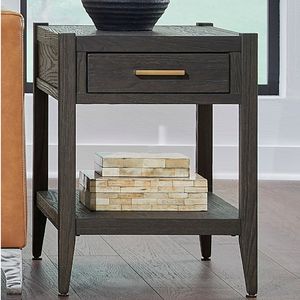 The Manhattan collection is comprised of seven pieces with plenty of storage and function designed into each piece. Two different cocktail tables, including a large rectangle with three drawers and also a bunching ottoman offer a choice depending upon the size of the space. Additionally, the shelves and drawers on selected pieces not only enhance the design but provide further storage capability as well. Oak veneer and Baichun solids in an Espresso finish with vintage brass finished decorative hardware.
