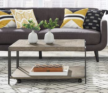 Distinctive styling that takes it's cues from the American Industrial Age. A mixed media collection of metal and a decorative parquet pattern top. Constructed with Fir solids and veneers and in a Weathered Pine wood finish and Gunmetal metal finish. Faux leather inset top.Read More