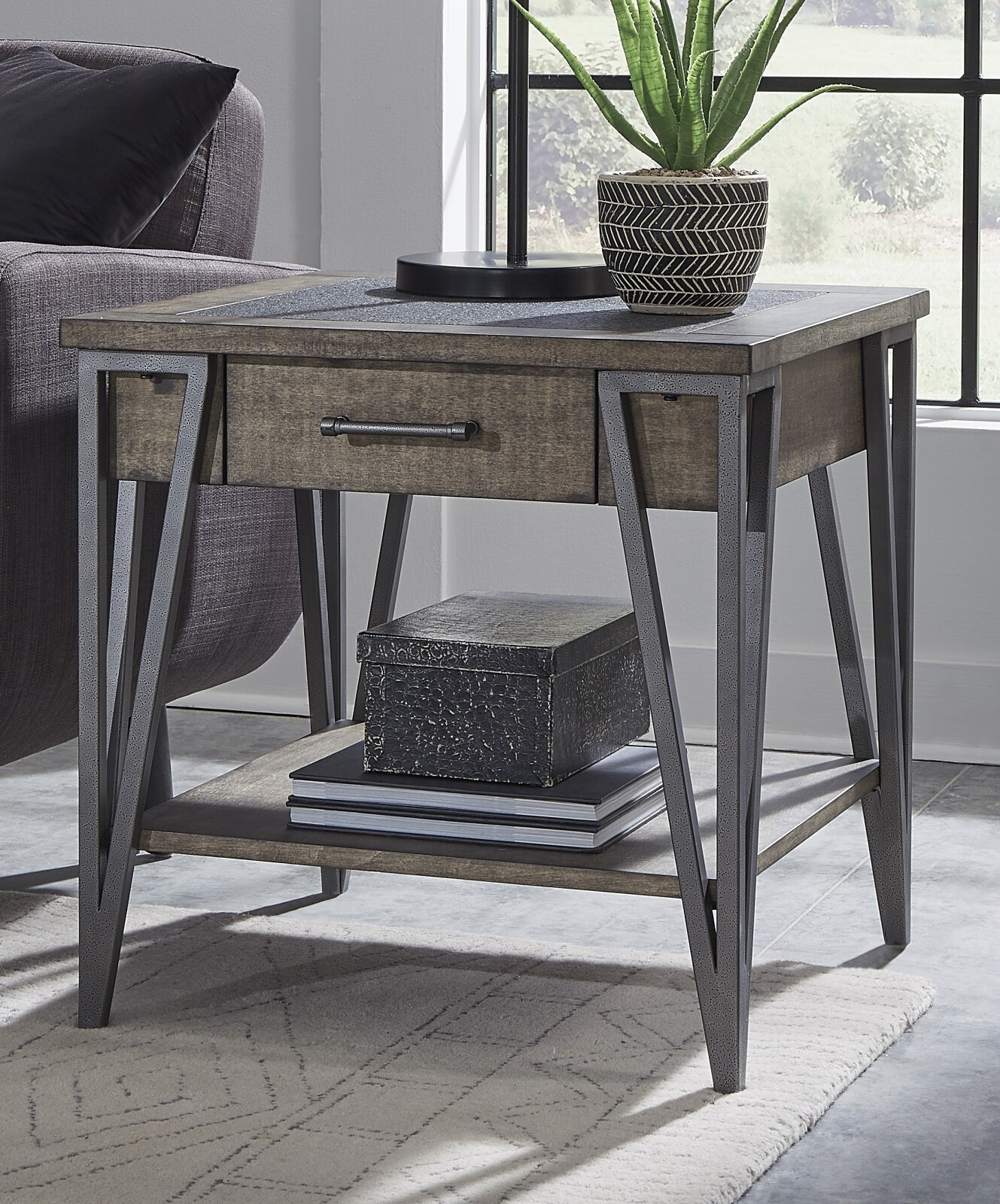 Combining wood, metal and stone featuring both industrial and architectural styling. Poplar Solids and Mindy Veneers in a Smoke Finish with Fired Granite Top Inserts and complemented with Titanium Finished Metal Legs and Drawer Pulls.Read More