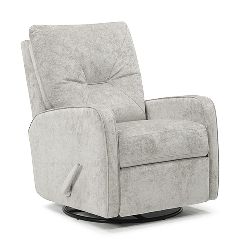 The Theo recliner is all about a smaller scale without sacrificing comfort. The sleek narrow arms add a modern touch, accentuated with a piping trim. The unique back treatment is inspired by a toss pillow and the diagonal stitching and piped back details create a singular design statement. Take a seat on the high-resiliency foam, recline back and find perfect relaxation as you sink into luxurious comfort. The padded armrests have a subtle rounded shape. An extended footrest offers additional support when lounging or watching television in a fully reclined position.Read More